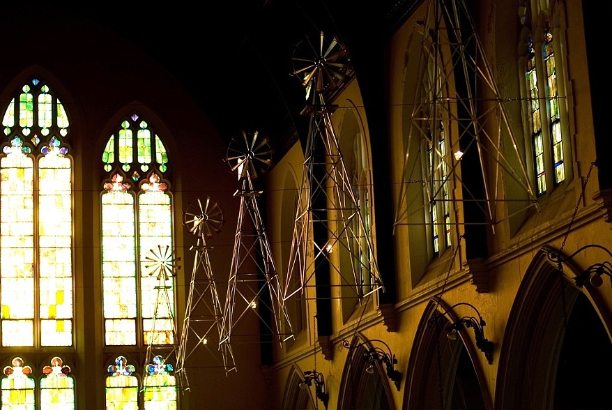 Bezoekers houden hun adem in als ze de kerk binnengaan en geconfronteerd worden met een verrassend beeld: boven hun hoofden hangen twaalf enorme windmolens als in slagorde in de kerkruimte, dreigend en imponerend, omgeven door het gotische gewelf. De windmolens zijn onverwachts, anachronistisch en misplaatst in deze setting.