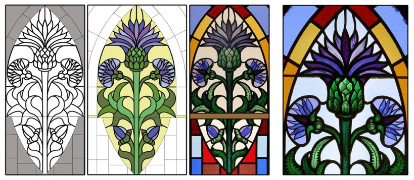 Na goedkeuring werd het ontwerp uitgeprint en werd het glas gesneden en gebrandschilderd.