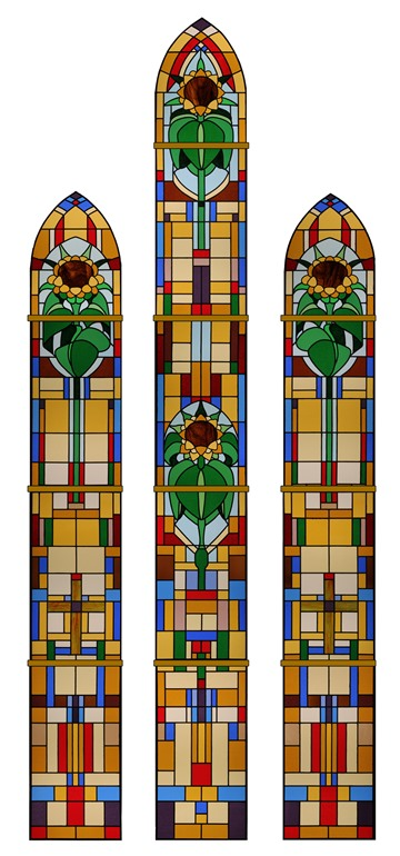 Voor de ramen voor achter het orgel waren gelukkig nog zwart-wit foto’s beschikbaar voordat het orgel geplaatst was. Niet helemaal scherp, maar toch redelijk leesbaar. Hier was indertijd gekozen voor de zonnebloem, symbool voor levenslust, geluk, liefde, vertrouwen, vruchtbaarheid en Christus.