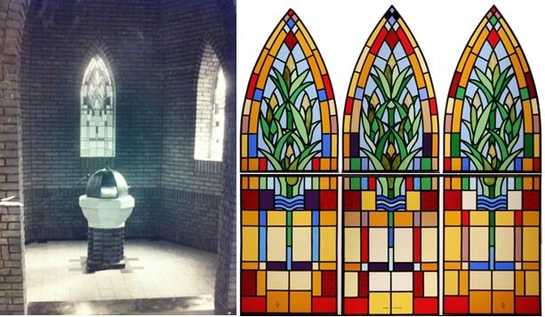 Van de doopkapel waren een paar zwart-wit foto’s beschikbaar waarop één van de drie ramen te zien was. Gekozen is hier voor de lis vanuit de connectie met water en doop.