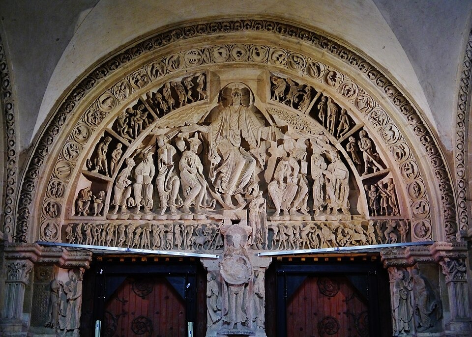 In Autun beeldde Gislebertus aan het begin van de twaalfde eeuw Christus af te midden van zijn apostelen. In Vézelay, ongeveer honderd kilometer ten noordwesten van Autun, hakte een naamloze tijdgenoot van Gislebertus ook een timpaan uit de kalksteen. Hij komt uit dezelfde school. Het timpaan boven de grote deuren van de westwand, in de narthex (voorhal) van de Madeleine, toont de triomferende Christus, afgebeeld binnen (op de bogen of archivolten) de tekens van de dierenriem en de maanden, dus van de kosmische en de menselijke tijd, terwijl hij zijn discipelen naar alle volkeren van de wereld zendt. Het werk is ongeveer tussen 1120 en 1130 ontstaan en weerspiegelt een zich uitbreidende wereld waarin de mens als door Christus gezondene een voorname rol speelt.