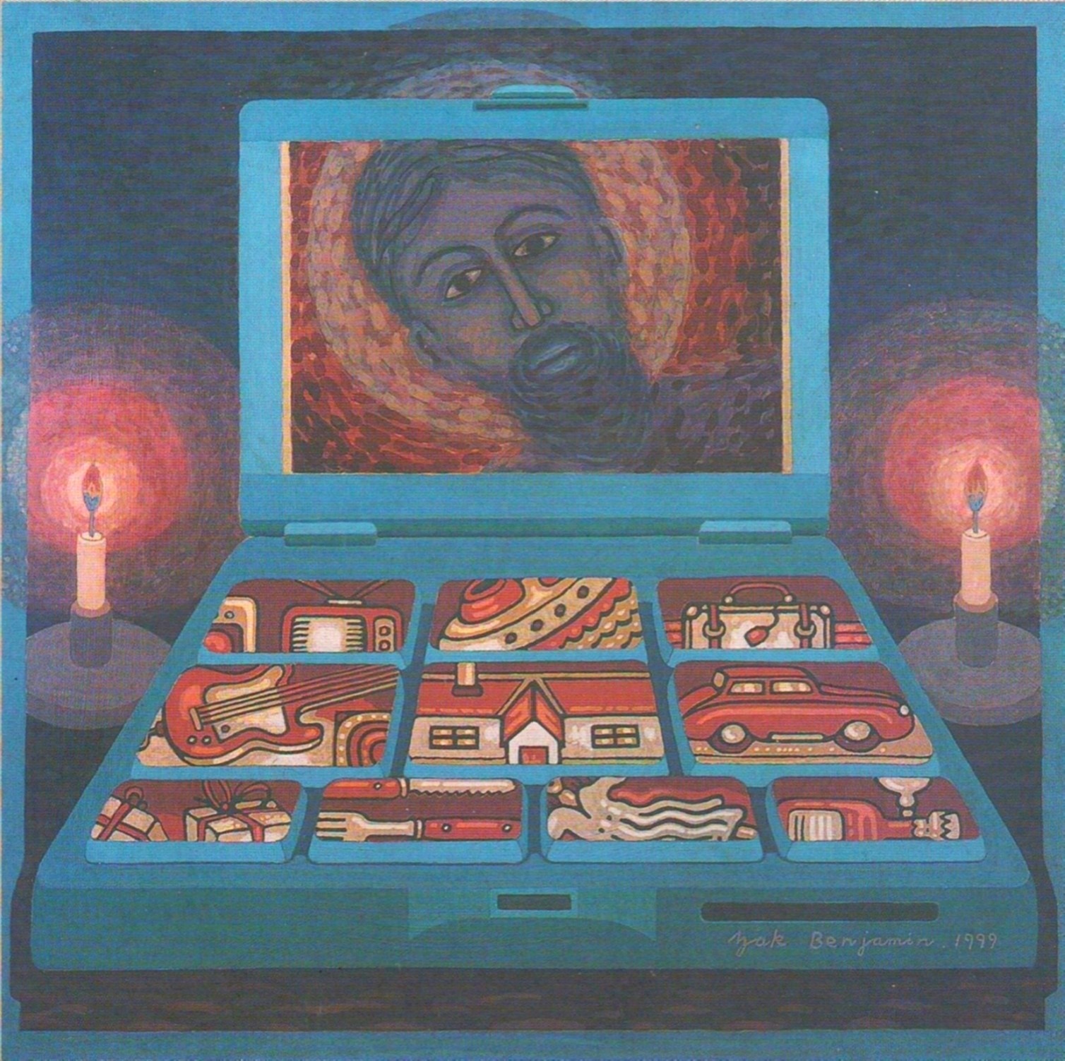 Steeds weer dreigen we na te jagen wat alle mensen om ons heen ook najagen: een leven van luiheid en vermaak, van lekkere drankjes en overdadig eten, van roem en succes, in een groot huis met een stevige auto voor de deur, met op gepaste tijden een reis naar verre oorden. Dat zijn de bouwstenen van ons leven, de toetsen die we steeds weer intikken. We zien ze allemaal terug op het schilderij Christus en consumentisme van de Zuid-Afrikaanse kunstenaar Zak Benjamin. Wat we daarop weergegeven zien, zou een blokkendoos kunnen zijn. Of een computer. Beide laten zien wat de zich opeenstapelende bestanddelen zijn van het leven van de doorsnee mens van nu.