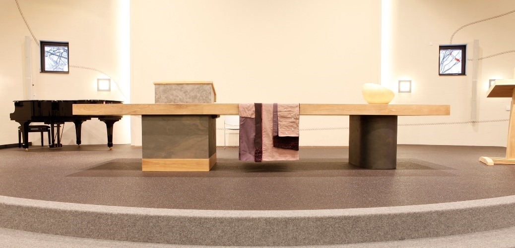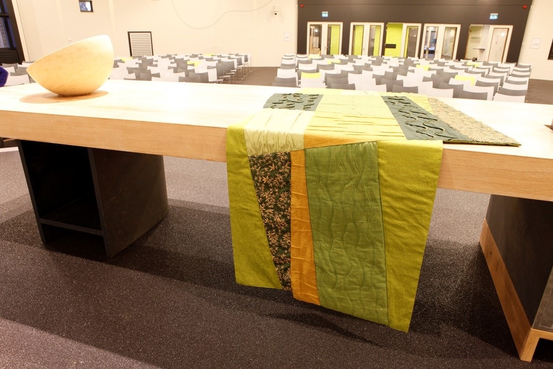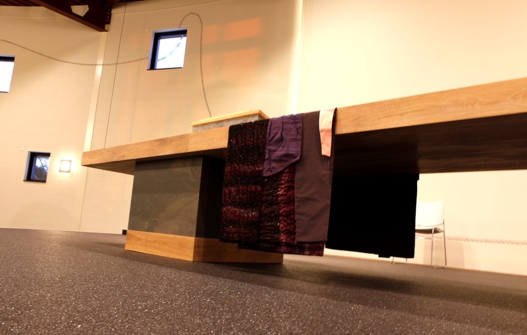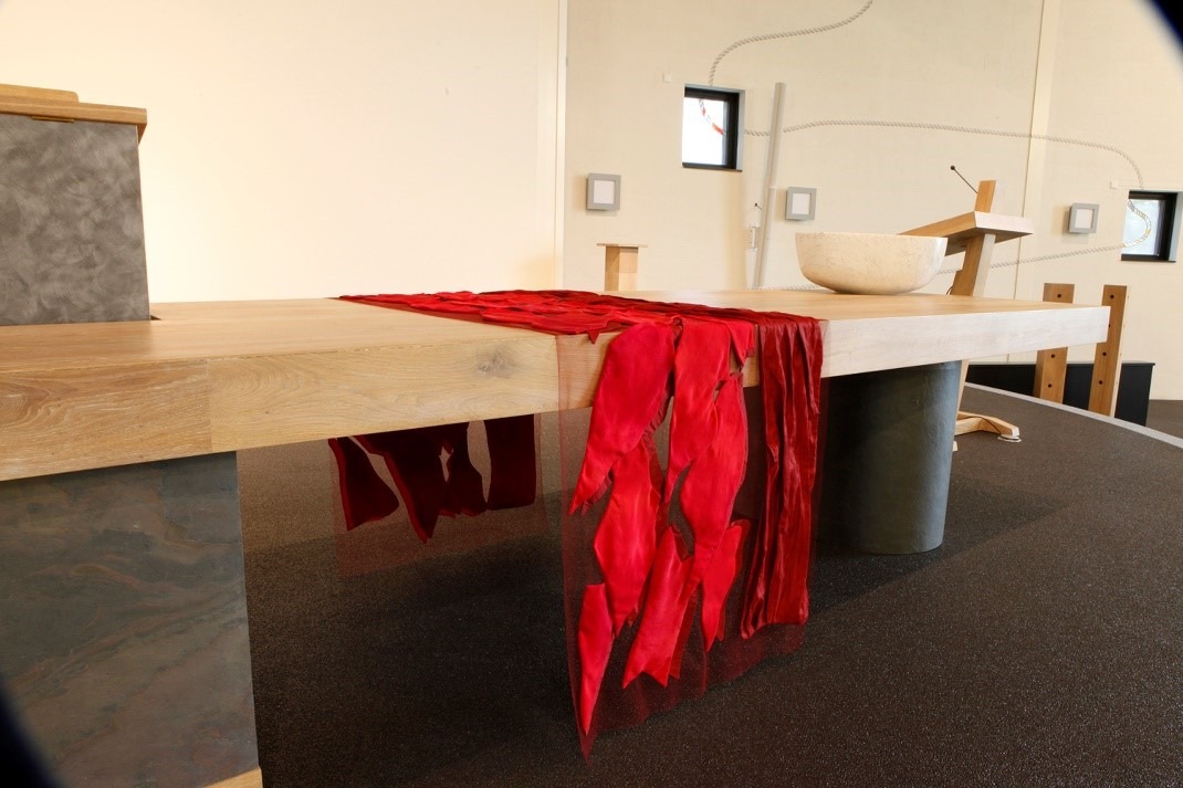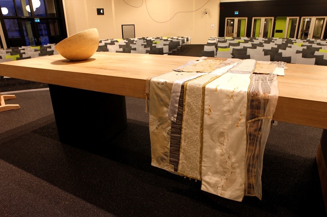 Als klein groepje professioneel werkende beeldend kunstenaars uit de gemeente zijn we uitgenodigd om na te denken over beeldende kunst in de nieuwe kerk. Mijn eigen gedachteproces kwam op gang toen ik het ontwerp zag voor de tafel. Het is een heel brede tafel en ik bedacht dat daar een kleed overheen zou kunnen liggen. Een liturgisch kleed wel te verstaan, te wisselen naar gelang de periode van het kerkelijk jaar.