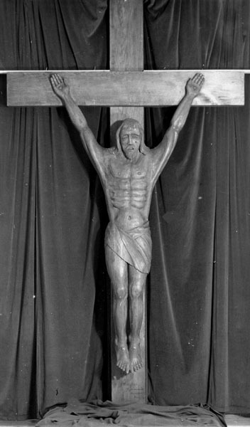 Cor Wijker: Crucifix, 1953-54, hoogte 350 cm, eikenhouten beeld in opdracht van het Anglicaanse seminarium in Hartford, Connecticut (VS).
