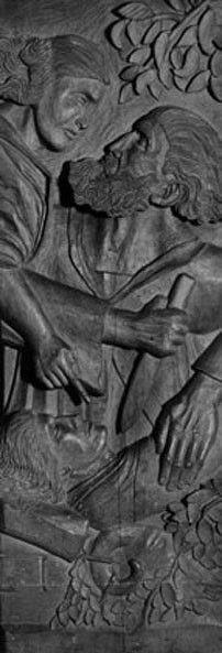 Cor Wijker: Samaritaanse vrouw, 1967, reliëf in afrormosiahout, gemaakt voor de preekstoel van de Gereformeerde kerk in Hoogeveen.