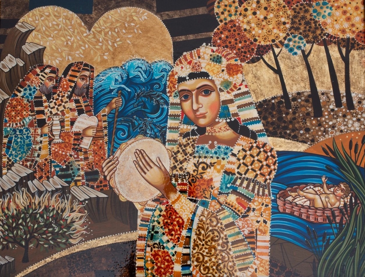Op dit schilderij van Silvia Dimitrova staat Mirjam op de voorgrond en in het midden, gracieus en blij. Haar hoofd is licht gekanteld wat doet denken aan traditionele afbeeldingen van Maria, maar in plaats van een baby houdt ze een tamboerijn in haar handen. Het doek dompelt ons onder in de wonderbaarlijke gebeurtenissen in het boek Exodus met als centraal moment het oversteken van de Rode Zee. Exodus 15:21 vertelt hoe Mirjam het volk leidde in vreugdevol gezang: ‘Zing voor de Heer, zijn macht en majesteit zijn groot! Paarden en ruiters wierp hij in zee.’
