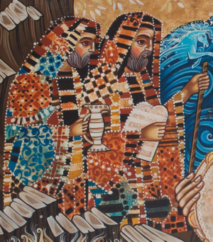 De drie volwassen figuren op dit schilderij vormen een soort drie-eenheid. Het is veelzeggend dat de profeet Micha deze drie deze figuren samen identificeert als degenen die Israël uit Egypte leidden: ‘Ik bracht jullie uit Egypte en verloste jullie uit het land van slavernij. Ik stuurde Mozes om jullie te leiden, en ook Aäron en Mirjam’ (Micha 6:4). Zouden we Mirjam kunnen beschouwen als een schaduw van de Derde Persoon van de Drie-eenheid? Degene die ons door een onzichtbare hand leidt en beschermt? Degene die de werken van God in herinnering roept?