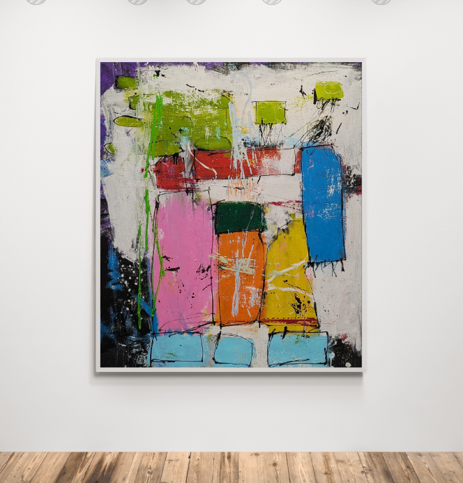 Now I’ve moved it around. I’ve tried to find the composition and a composition will appear. And then you work on it more. And then you’ll get back to that point and say, “This is good.” And then at the end, and this is the ultimate question that most people ask, “How do you know when a painting’s finished?” Andy Warhol said, when it’s sold, which is a good one because it’s never really finished. But you do get to a point where you’re happy with the result and then, take a step back and begin to decipher what has been done and, and then allow it to have that dialogue. “What is it saying to me? What am I getting out of this?”